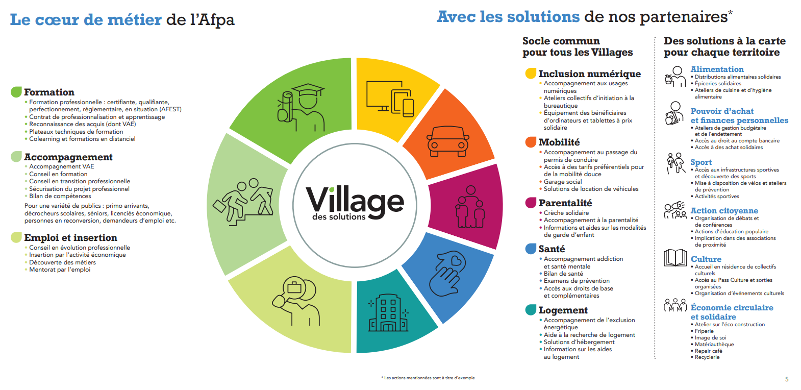 La réponse de l'Afpa : Ces défis nécessitent la mise en place de solutions innovantes et adaptées aux besoins spécifiques de chaque territoire. L’Afpa a ainsi développé une stratégie d’innovation territoriale reposant sur des coopérations locales et systématiques : les Villages des solutions. L’Afpa a initié cette démarche et l’a inscrite dans sa stratégie depuis 2020. Inspirée par les tiers-lieux, l’Afpa ouvre ses espaces pour accueillir ses partenaires et leurs activités, proposant ainsi aux publics et aux entreprises des solutions coordonnées pour l’emploi, la formation et l’inclusion.